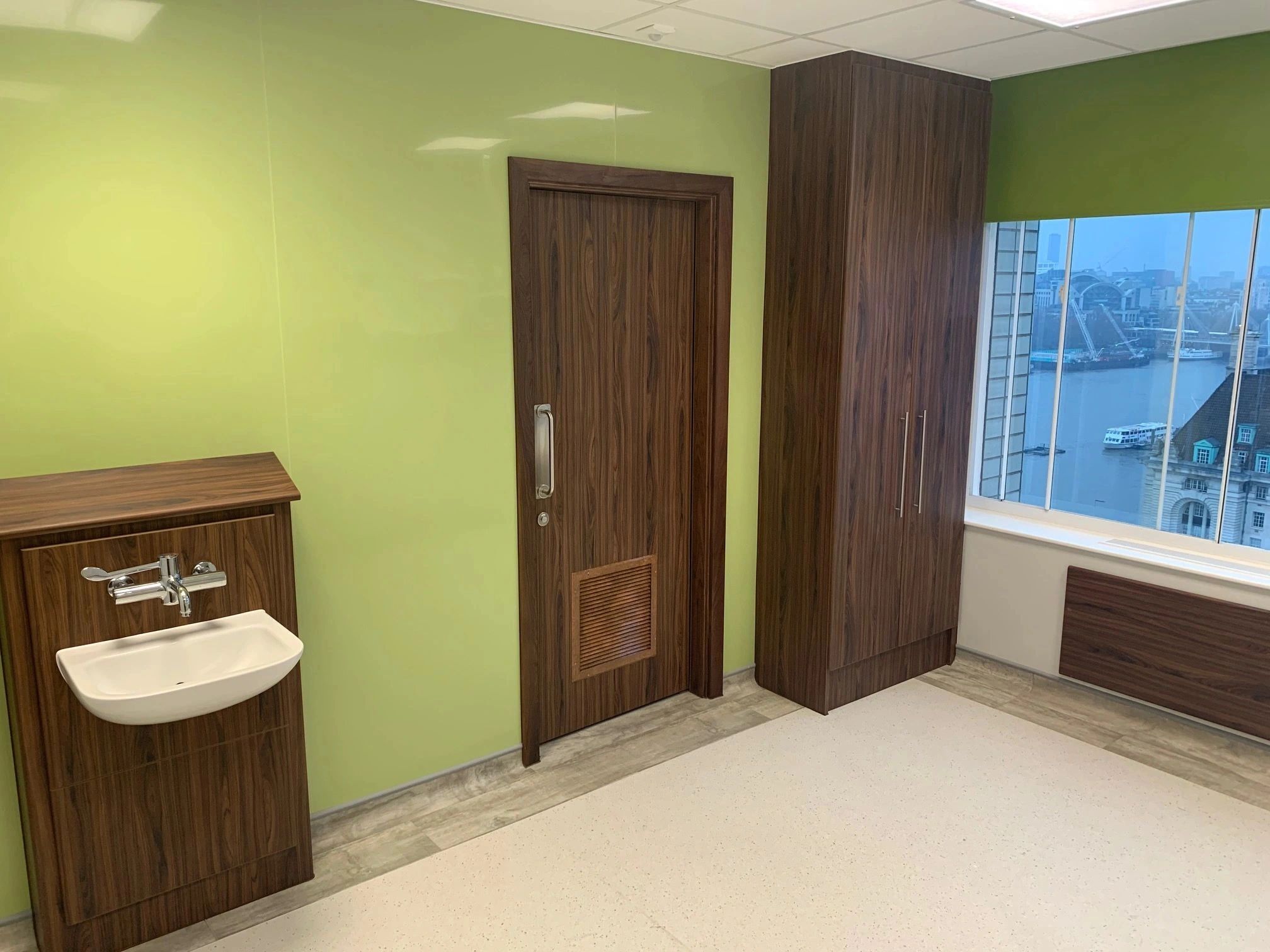 This new area for our London NHS client was built over the Covid 19 pandemic, Challenging project using our expertise in this area of design to create each ensuite bathroom accessible for maintenance staff without entering the room itself. Providing fantastic access for all future maintenance works without removing the patient from the room, every item on the design was fabricated in our workshop & delivered to site for installation.